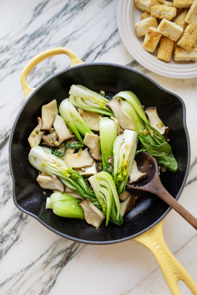 3. To the same skillet add remaining oil, garlic, ginger & mushrooms. Cook until mushrooms begin to soften, about 5 minutes.
